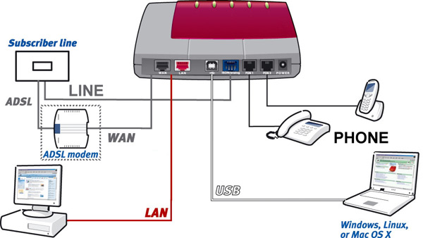 - LAN: port for your (home) network, you can connect e.g. your PC, lap-top, network-printer or wireless router